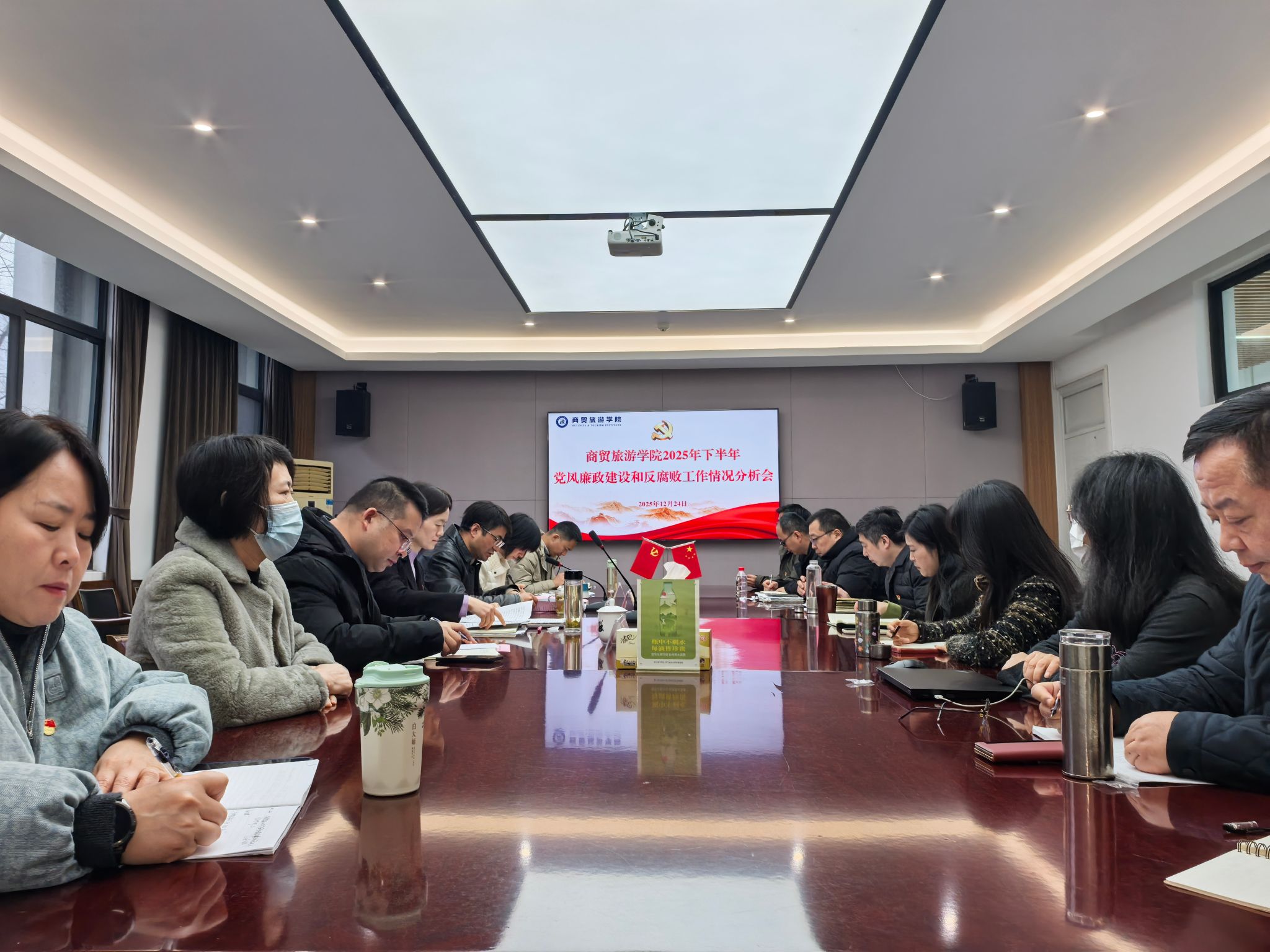 12月24日上午,商贸旅游学院党总支在8318会议室召开2025年下半年党风廉政建设和反腐败工作情况分析会。校纪委书记沈阳红,特约监督员段勇,分院领导班子成员,全体党支部书记、中层干部、专业负责人参加会议。会议由党总支书记张赵根主持。