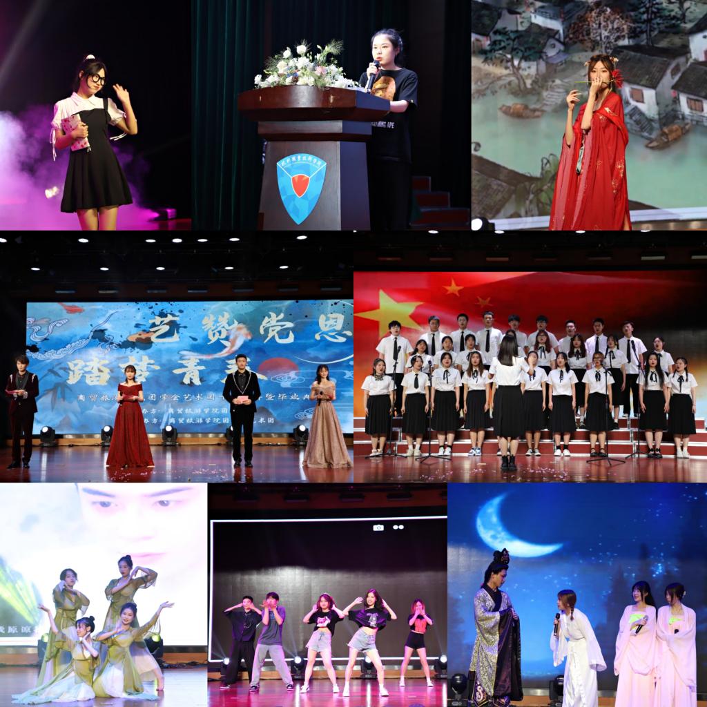 毕业生专题视频《毕业季》拉开了本次活动的帷幕。现代舞《tik tok》以令人耳目一新的风格带动了全场气氛;《回味经典歌曲串烧》唤醒在场观众的记忆,现场观众纷纷跟唱,尖叫声、呐喊声此起彼伏;情景喜剧《倩女幽魂》、《mini时代》冲淡了毕业季的不舍与眷恋,将欢笑带给现场观众,整个盛典高潮不断。来自电商1811班的毛盈欣作为毕业生代表发言,她饱含深情地回忆了在母校度过的难忘岁月,表达了对母校的感恩、不舍与眷恋,并寄语现场大一大二学生,希望他们珍惜在校时间,学习专业知识,赓续商贸优良传统,成为“阳光、睿智、自信、大气”的人。此外,商贸师生一起观看了团总支精心拍摄的《听老党员讲乡村新变化·喜迎建党百年》视频,现场师生随着镜头聆听了多位老党员讲述的浙江乡村的美丽变化,感受了中国共产党领导人民取得的巨大成就。最后,商贸合唱团带来大合唱《春天的故事》和《保卫黄河》,同学们在曼妙的歌声中感触红色故事,汲取奋进力量。
