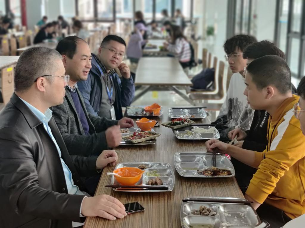 在学生食堂,三位老师与学生围桌而坐,共话家常。领导关切地询问学生的学习与生活情况,就学生最关心的专业学习与就业情况展开了深入的探讨,在为学生答疑解惑的同时,勉励大家应珍惜在校时间,积极思考,主动做好人生规划,努力实现人生价值。