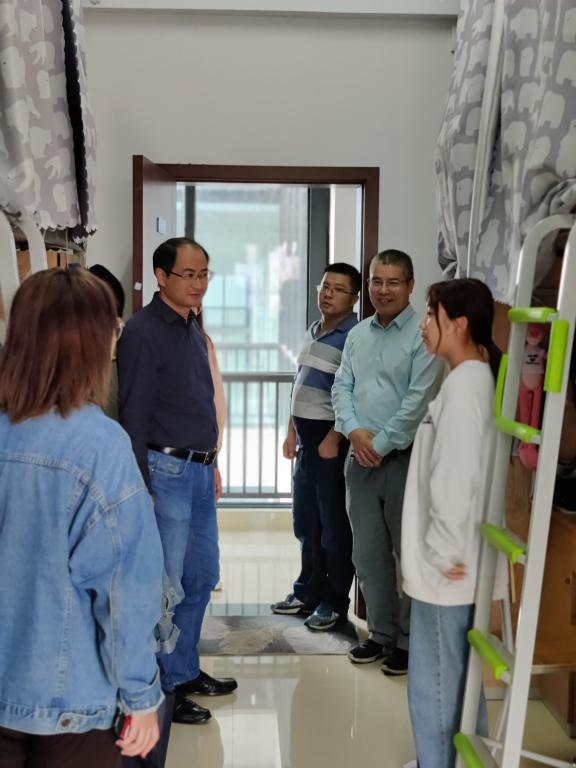 用餐结束后,分院班子三人又前往学生寝室走访探望。在公寓前台老师与宿管员认真交流,询问公寓情况和商贸学生表现。随后张赵根一行实地走访学生寝室,查看学生寝室状况。他们与在寝同学进行了亲切交流,了解学生生活近况,为学生解答相关问题,并用真实的学生案例勉励同学们珍惜时间,努力学习。老师们更借此机会对寝室安全文明、疫情防控再三嘱咐,对寝室的优缺点进行了指正。