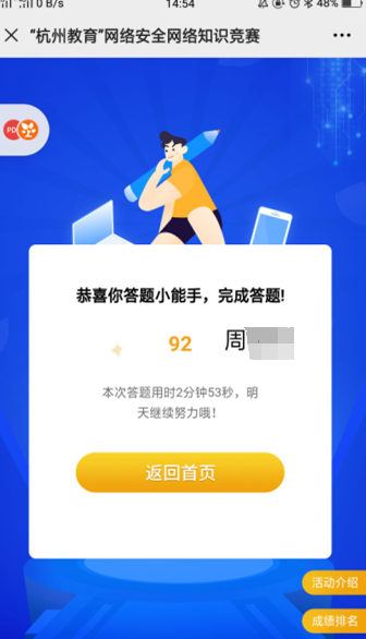 根据学校的要求,商贸旅游学院各班组织班会等,努力做到将“网络安全”传达到每个同学。同学们通过自主学习,利用之江教育汇广场、浙江网安在线平台,观看视频材料,聆听“网络信息安全与防护”讲座,学习“隐私保护”、“个人信息保护”等知识。同学们还积极参加“杭州教育网络安全网上知识竞赛”,巩固学习效果。此外分院团总支也通过微信公众号,制作微信内容,及时将网络安全的相关知识传递给广大同学。