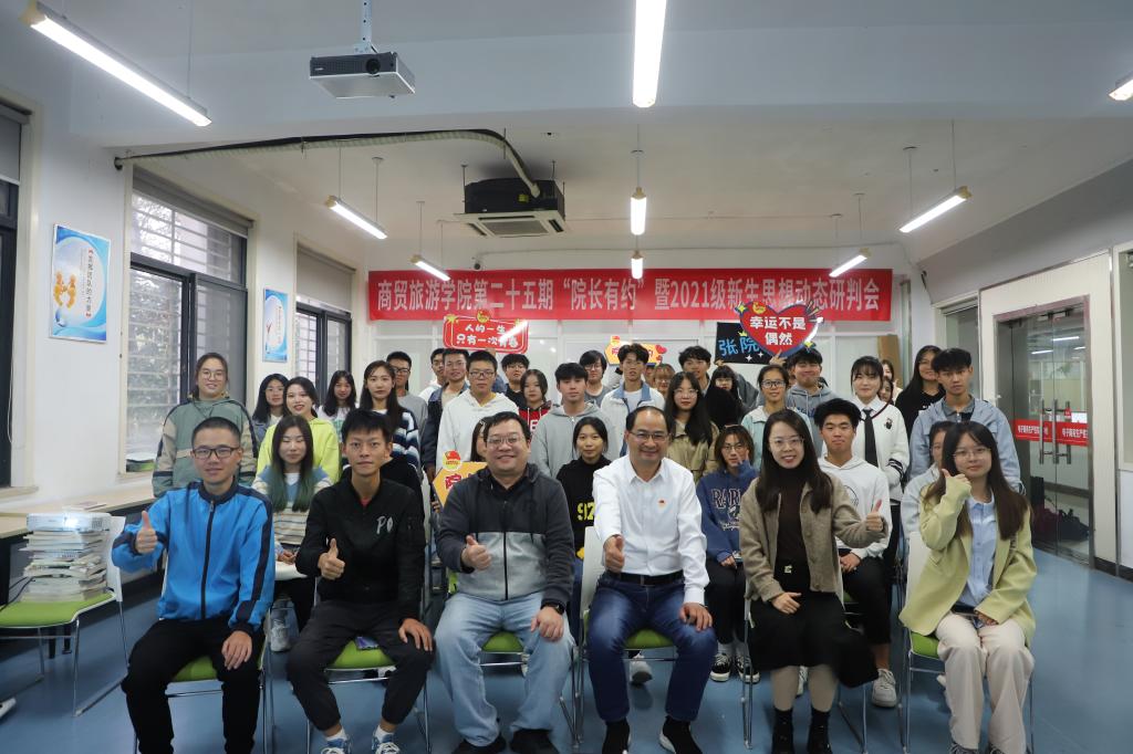 秋意渐浓,转眼间新生入学已一月有余。为全面了解大一新生思想动态并让同学们尽快融入大学生活,10月20日下午,商贸旅游学院在8108教室召开了第二十五期“院长有约”暨2021级新生思想动态研判会。党总支书记、院长张赵根、学工办主任王晓磊及大一各班新生代表参加本次活动。会议由团总支负责人赵媛媛主持。