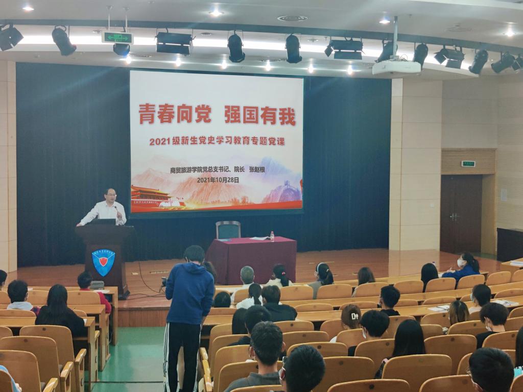 学好党史,树立共产主义理想,坚定信念跟党走,是每一名新时代大学生的应有之义,更是使命责任。为了让新生加强对党的认识,厚植爱党爱国情怀,10月28日晚,商贸旅游学院明志启航课开讲,党总支书记、院长张赵根为同学们讲授党史学习教育专题党课,党总支副书记周佳良作入党启蒙教育。按照疫情防控要求,2021级全体新生分别在行政楼报告厅和各班级教室听讲。