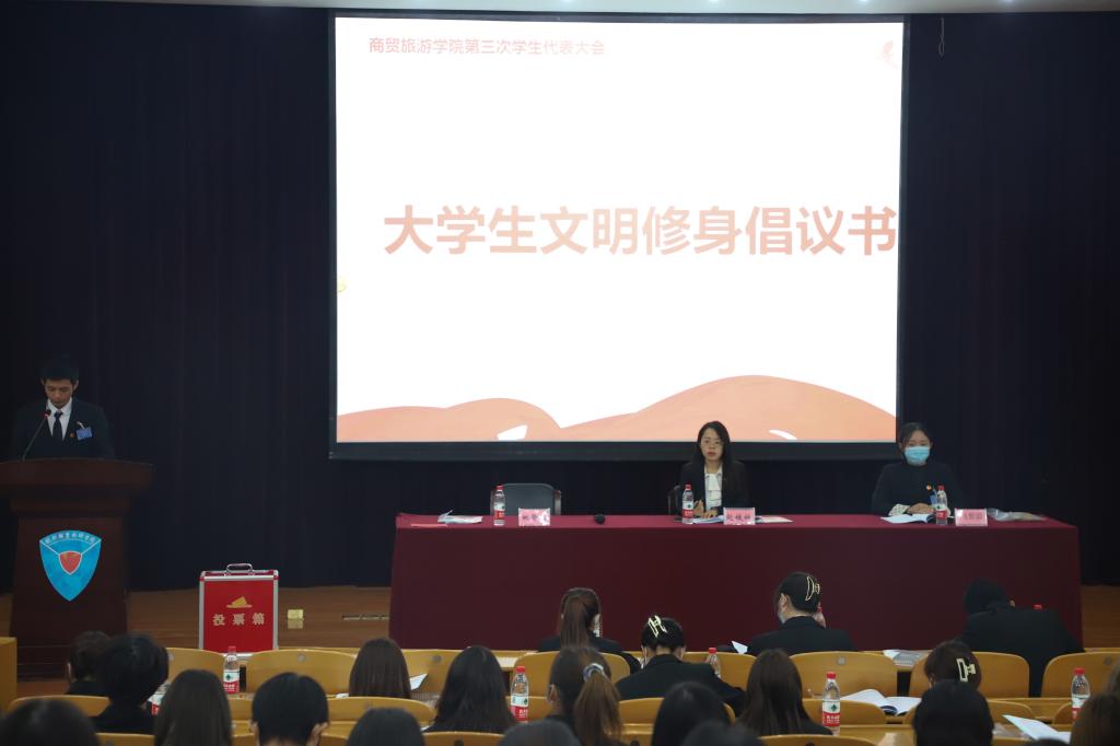 借此次学代会之际,商贸旅游学院面向全体学生发出大学生文明修身倡议,把文明修身、立德明礼作为商贸学子的自觉实践,共同建设“尊师、明礼、爱校”的文明校园,争做文明的先行者和传播者,为全面推进分院高质量发展,积极助力学校“双高计划”建设共同努力奋斗!