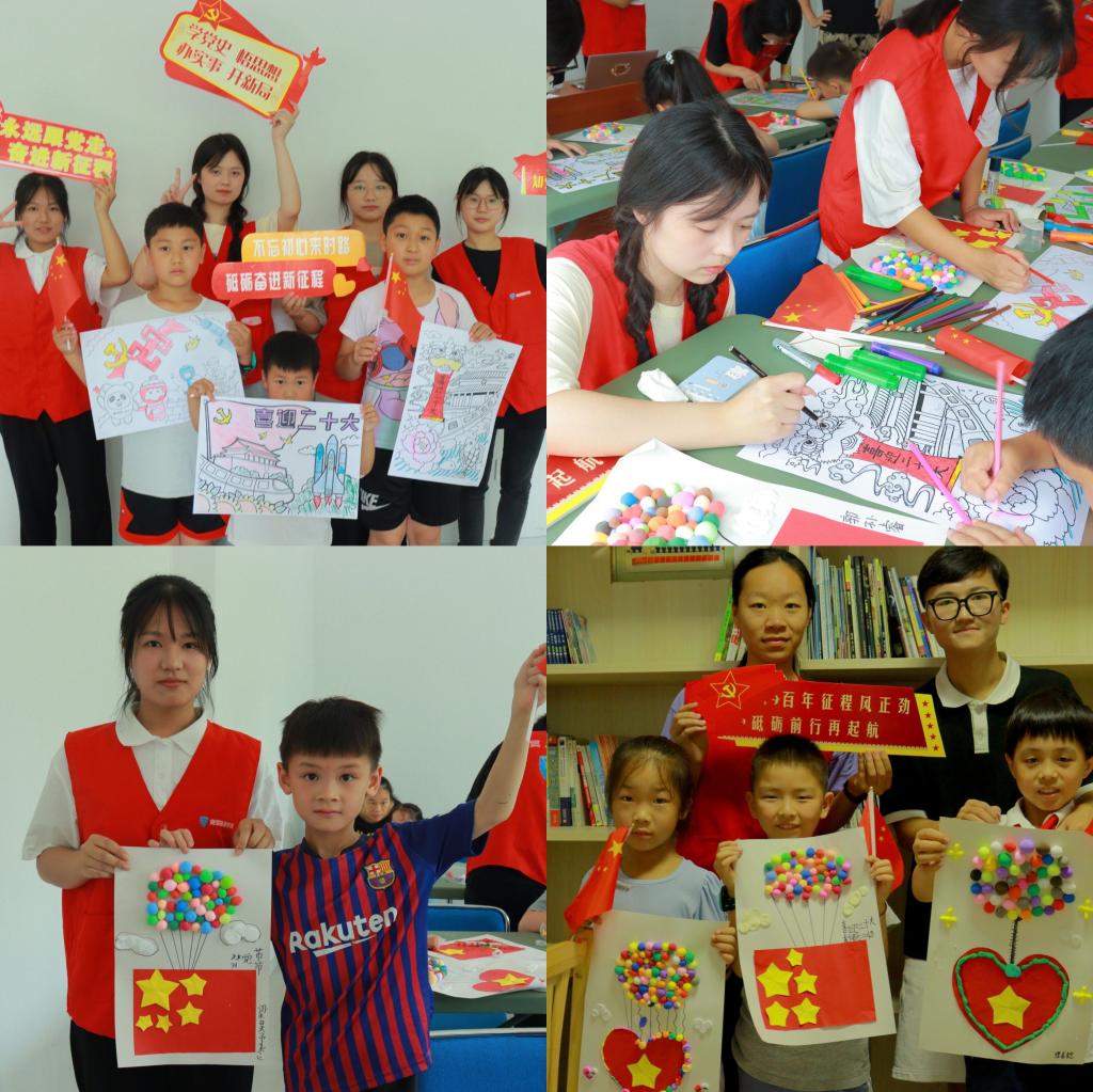 为喜迎党的二十大的热烈召开,激发儿童爱党爱国之情,2022年6月30日,商贸旅游学院“大手牵小手,共筑新未来”志愿服务队在白杨街道海天社区开展了“喜迎二十大,童心向未来”专题活动。该活动由李剑桥、赵媛媛和陈玉燕老师组织带领9名学生共同开展,许梦娇、王航杰主讲专题内容。