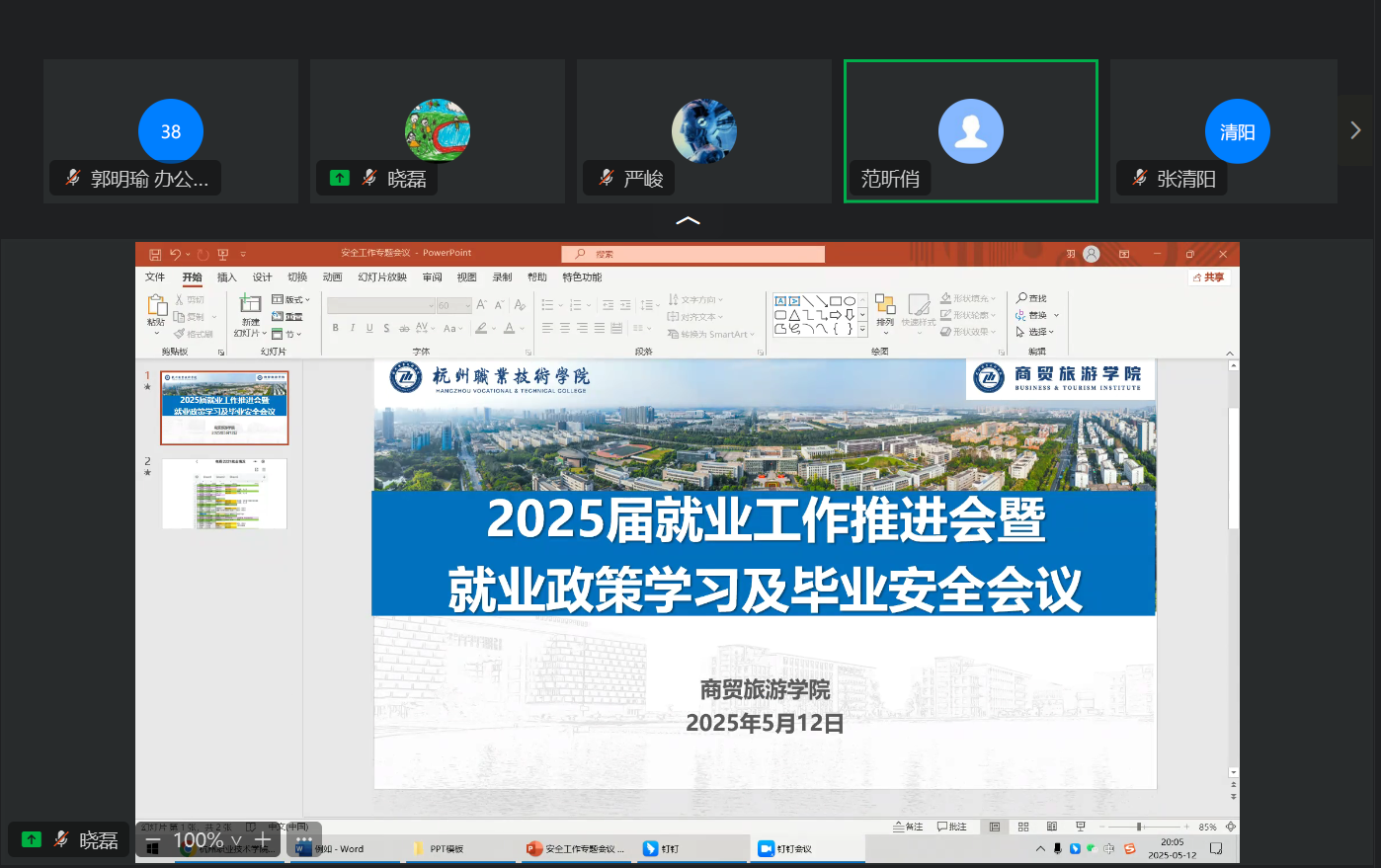 为进一步推进商贸旅游学院2025届毕业生高质量、充分就业,切实保障学生就业毕业安全,5月12日晚,商贸旅游学院通过钉钉平台线上召开2025届就业工作推进会暨就业政策学习与毕业安全专题会议。学院党总支副书记范昕俏、学工办主任王晓磊、就业辅导员郭明瑜及全体毕业班班主任参加会议。