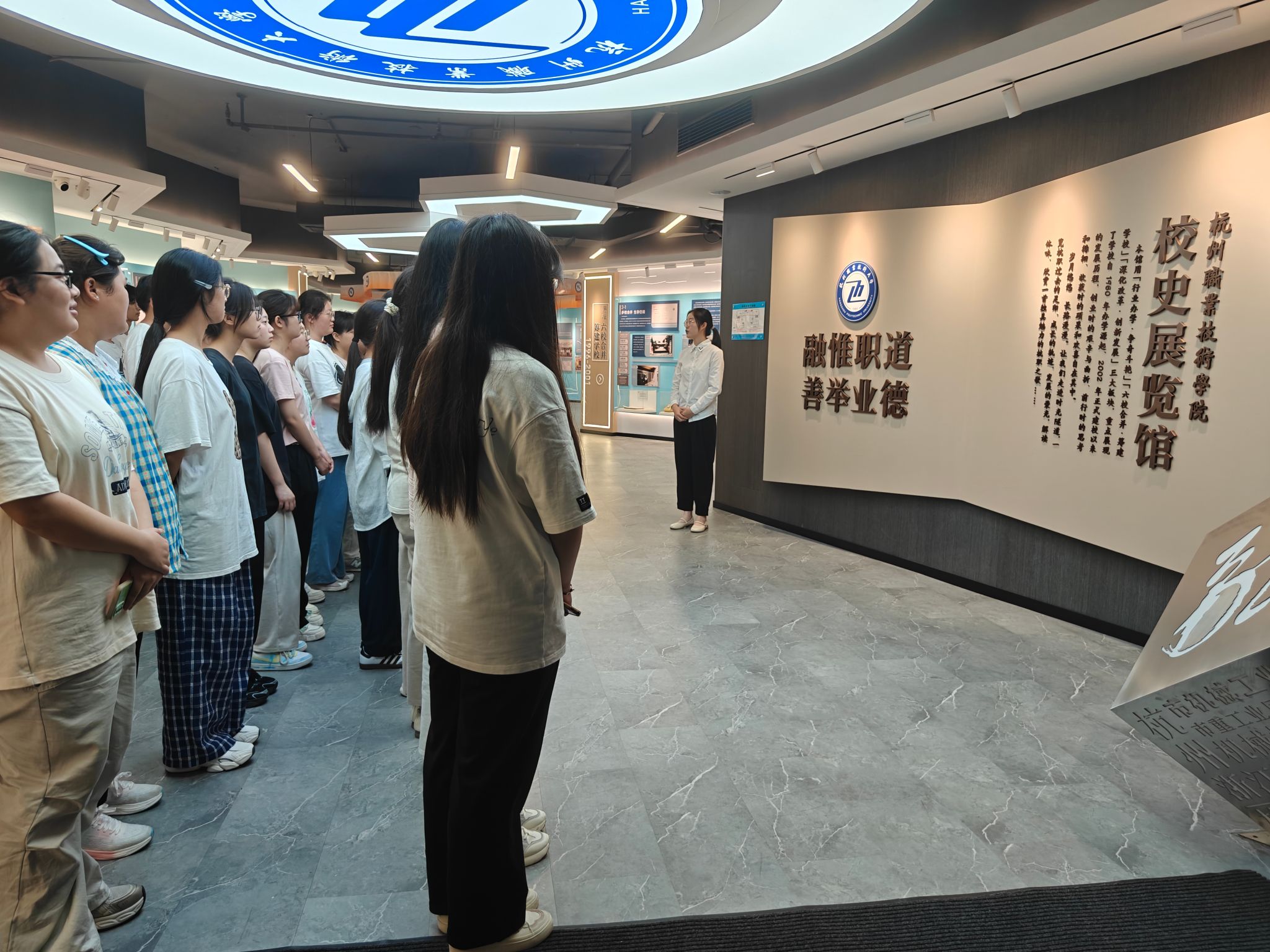 在分院智慧旅游技术应用专业讲解队学生的引导下,新生们依次走进校史馆和非遗馆。校史馆、非遗馆内的图文展板、实物模型生动再现了学校的发展历程与办学成就,使同学们深切感受到“数智杭职、工匠摇篮”的深厚底蕴。许多新生驻足在校史馆陈列前,脸上流露出自豪之情。而非遗馆的各类文化遗产展品则向新生们展示了传统技艺所蕴含的文化精髓与工匠精神。