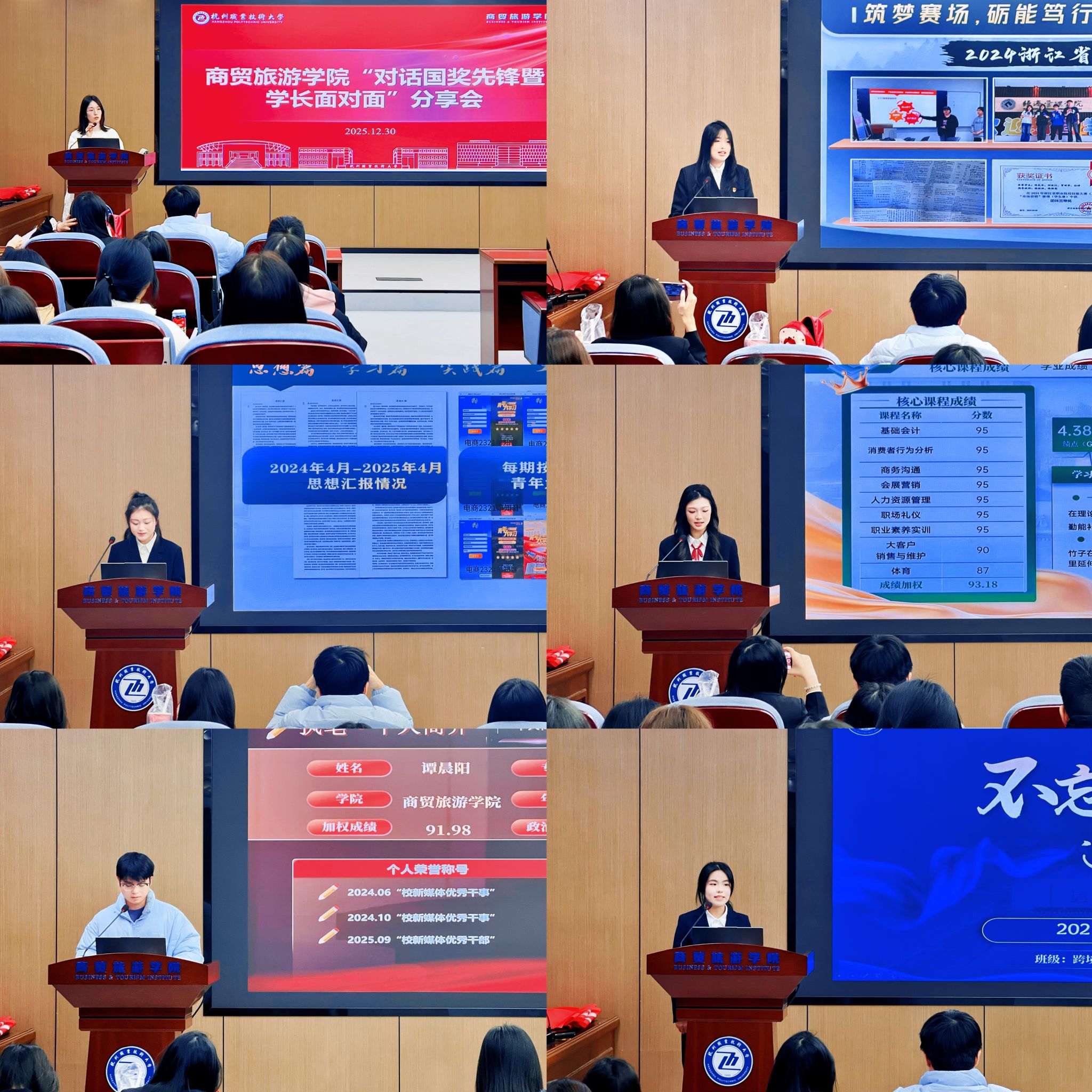 活动现场,五位国奖获得者结合自身成长经历,从学业规划、竞赛备赛、实践探索、学生工作等多个维度展开分享。任婷以“深耕专业,逐光而行”为核心,分享了自己保持学业与综测双第一的自律方法,以及带领团队斩获全国电商“三创赛”特等奖的竞赛经验;单知音聚焦直播电商专业实践,讲述了累计1200余小时直播背后的坚守与成长,传递了“心有向往,不惧道阻”的拼搏信念;赖怡依、谭晨阳、麻亚妮则分别结合学生工作履职、志愿公益践行、跨境电商技能提升等经历,分享了平衡多元角色、积累成长力量的心得,强调了扎实专业功底与主动担当作为的重要性。