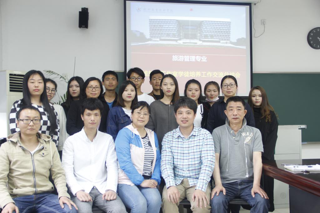 2017年4月26日下午,商贸旅游学院召开了旅游管理专业“在线旅游工作室”学徒培养工作交流总结会,与会人员有商贸旅游学院领导、杭州海梧户外运动策划公司(新加坡Tplus International Pte Ltd.分公司)总经理、副总经理和常驻学校师傅、旅游管理专业组教师、在线旅游工作室实习生(学徒)和16级新生代表。
