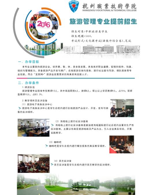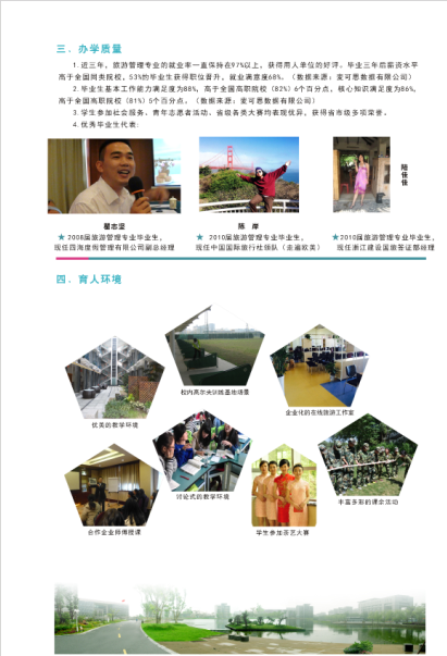 ◎师资队伍——旅游管理专业现有专任教师12人,其中高级职称4人、讲师8人;硕士以上学历教师9人,占75%;双师型教师10人,占83.3%。