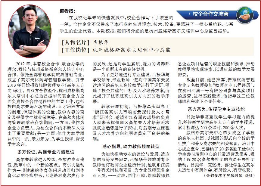 编者按:在我校近年来的快速发展中,校企合作写下了浓重的一笔。合作企业不仅带来了本行业的先进观念、技术、设备,更派驻了一批心系杭职、心系学生的企业代表。本期校报,我们将介绍的是杭州威格斯高尔夫培训中心总监吕振华。