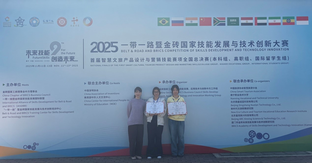 本次大赛由金砖国家工商理事会中方理事会、“一带一路”暨金砖国家技能发展国际联盟等单位联合举办。在我校市场营销专业教师虞双杨、朱小怡的指导下,参赛团队将专业知识与智慧旅游场景深度融合,通过市场调研精准把握行业趋势,在智慧旅游产品设计、数字营销策划等竞赛环节中展现了扎实的专业素养。