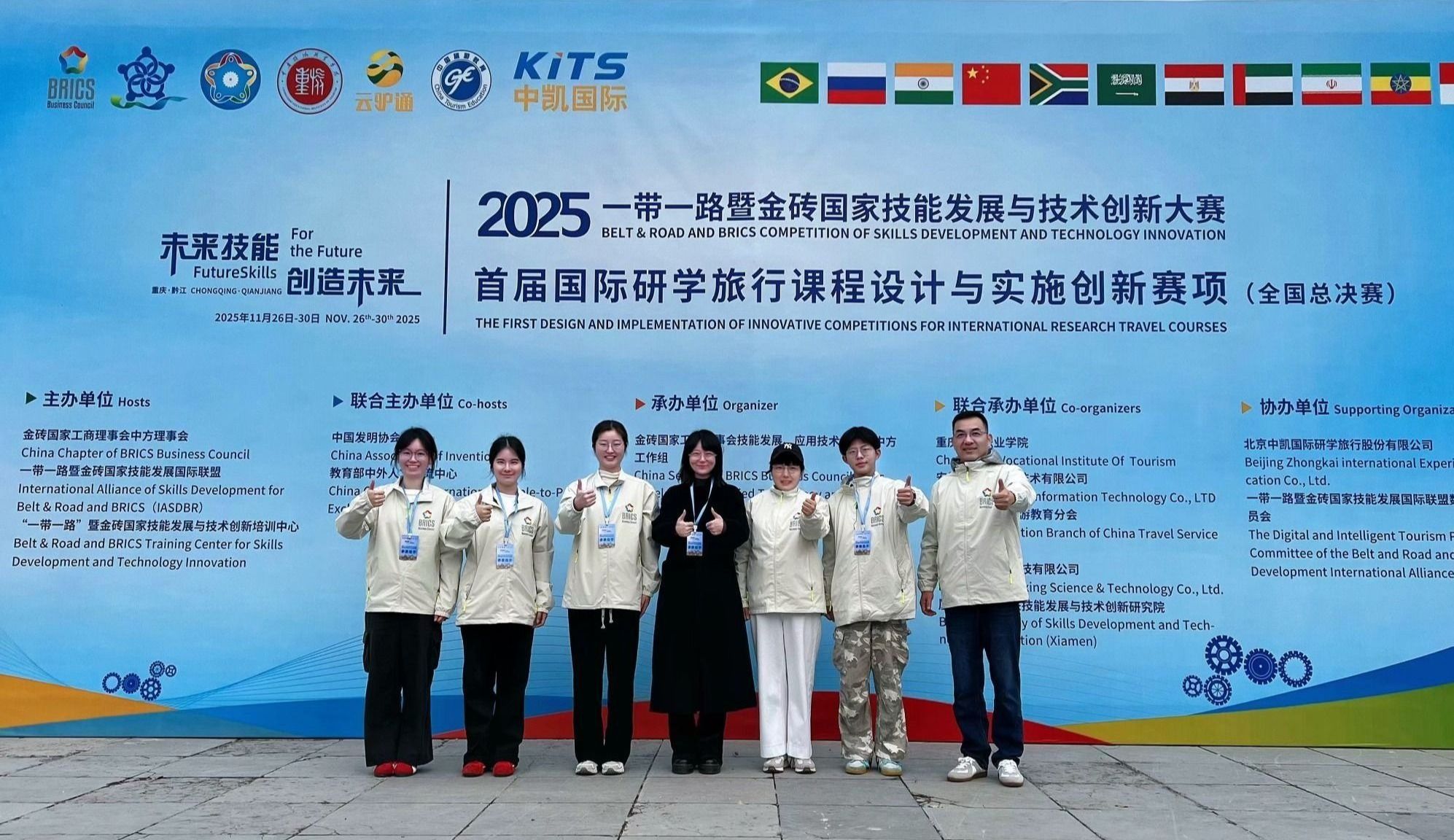 11月28日至12月1日,在2025一带一路暨金砖国家技能发展与技术创新大赛之国际研学赛项全国总决赛中,我校商贸旅游学院智慧旅游专业师生团队表现突出。洪林灿、邓雅楠、夏润涵、苏天阳四位同学在邢剑飞、张伟国老师指导下获职教组三等奖;邢剑飞、张伟国、黄蕙芊三位老师获教师组三等奖。