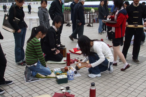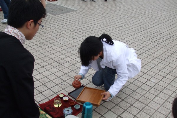 4月14日下午2:30分,2008年清河坊民间茶会在伍公山州治广场举行。 苏州评弹声中,旅游管理专业学生席地而坐,将自带的茶叶在茶具里悉心泡好,每人所泡茶水,供给右面的3个人喝。而其所饮茶,又来自左面的3人所供,同学们泰然自若的神情、熟练的操作技能、良好的团队协作能力,展示了杭职旅游管理专业学生的风采。