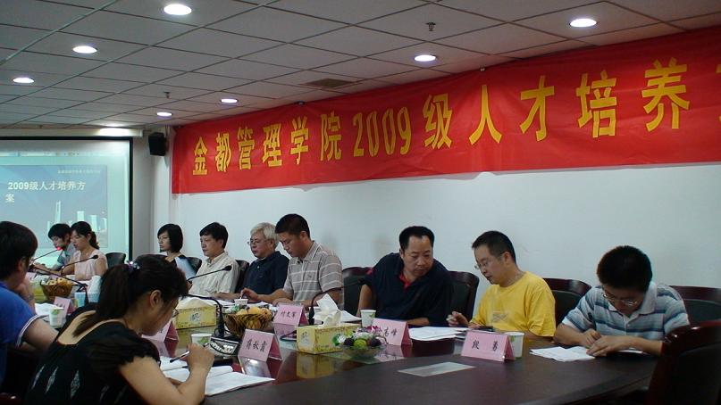 2009年8月18日,金都管理学院在行政楼第一会议室召开了2009级人才培养方案研讨会。会议邀请了廖志林、陈加明、傅立军、徐高峰等学院与教学职能部门领导出席。我院谢院长、韩书记、戴副院长、专业负责人和多位专任教师参加了本次会议。本次会议的中心议题是剖析、讨论我院各专业2009级人才培养方案。会议由戴副院长主持。