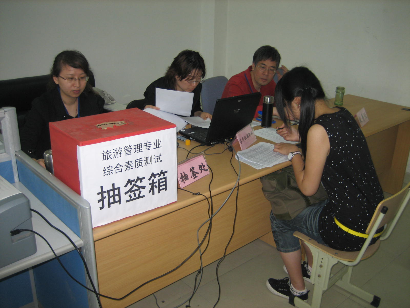 通过前期的准备、宣传工作,最终有100多名应届高考生通过网上报名的形式参加本次自主招生综合素质测试。考生于4月24日进行了现场报名确认,通过审核42名考生符合综合素质测试条件,参加4月25日早上8点开始的英语口试和专业面试。评委老师本着“公平、公正、公开”的原则,根据英语口试、专业面试的综合成绩,酌情降低入取分数,最终将结合考生的高考成绩入取29名学生,成为09级旅游管理专业的新生。