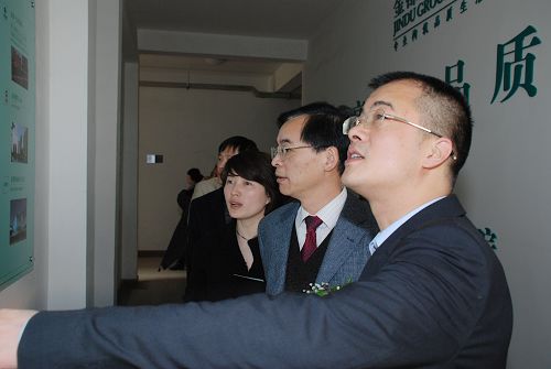 (图为李书记观看金都管理学院的企业文化宣传展板.)