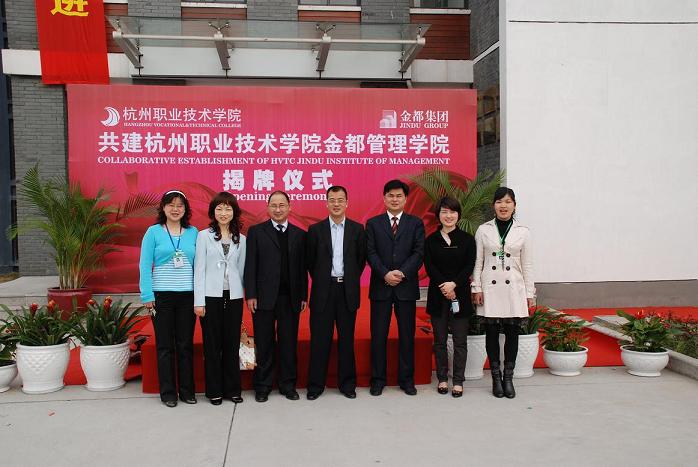 2009年3月18日,“金都管理学院”揭牌仪式在杭州职业技术学院隆重举行。金都房产集团总裁吴忠泉、金都物业公司总经理鲁海平、副总经理裘行丽、杭州职业技术学院党委书记李志海、副院长韩时林、学院各行政部门和分院、系的领导以及金都物业公司的员工、金都管理学院师生参加了本次揭牌仪式。