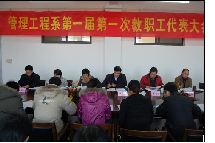 2009年1月15日,管理工程系胜利召开第一届第一次教职工代表代表大会专题会议。会议议题是审议通过“管理工程系与金都房产集团合作、成立金都管理学院”、《管理工程系年度工作考核暂行办法(试行)》和《管理工程系津贴分配暂行办法(试行)》三项方案。