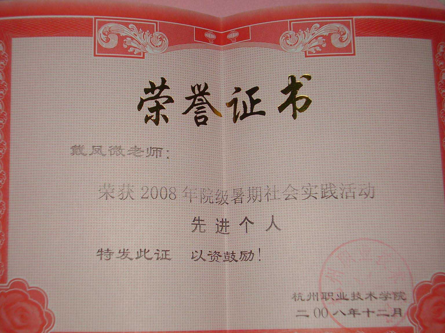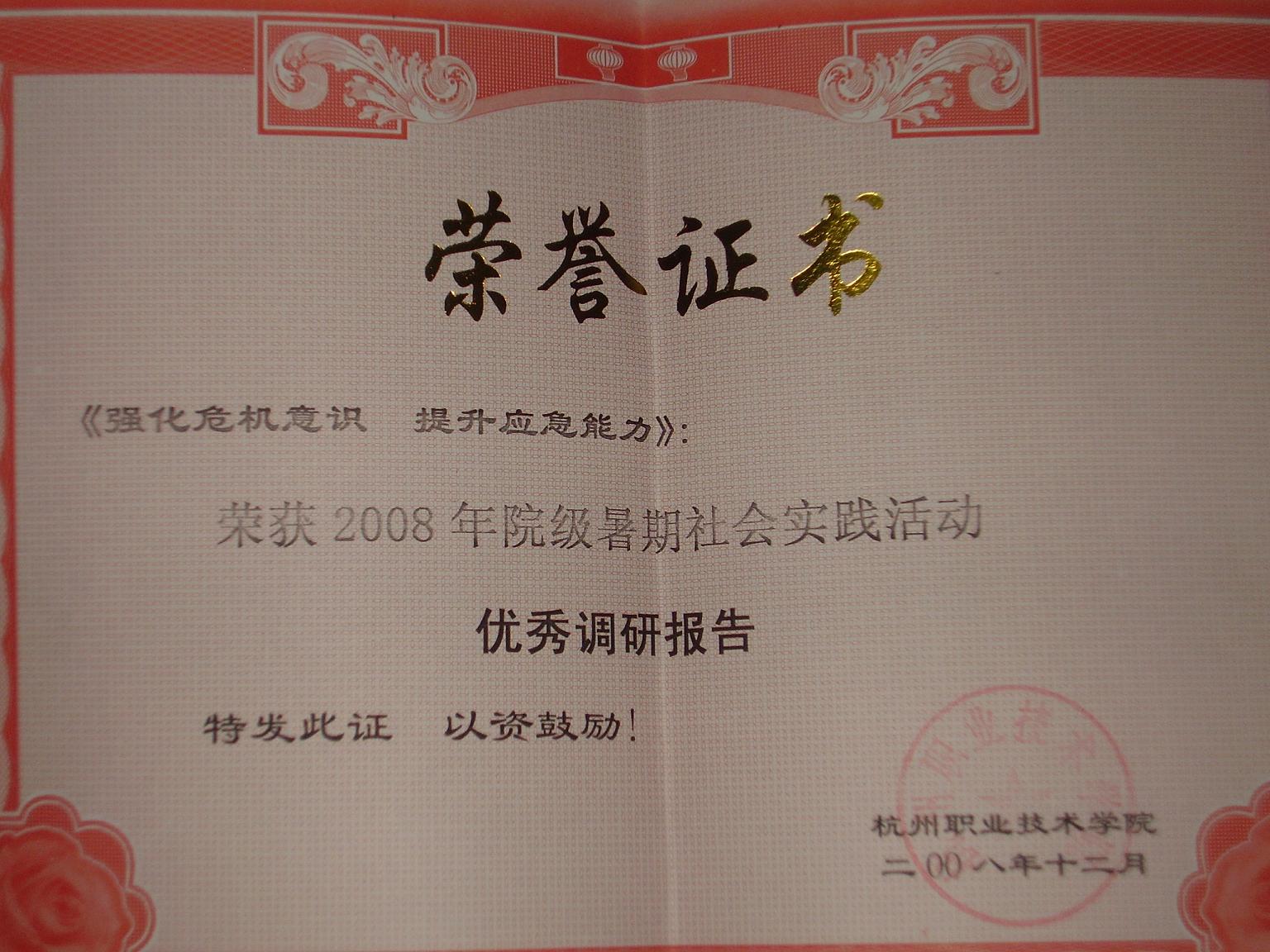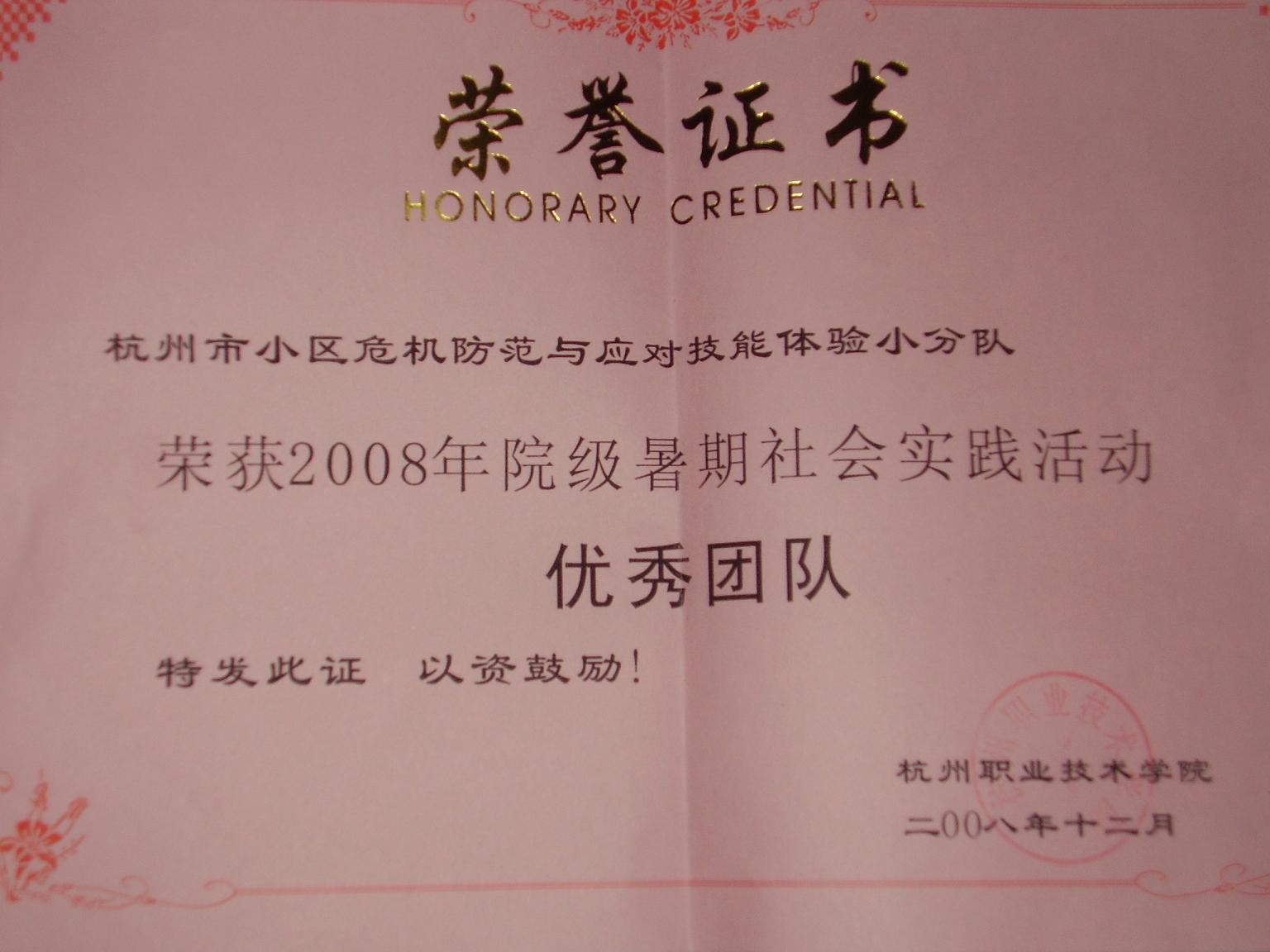 2008年12月24日,在我院“2008年大学生暑期社会实践表彰大会”上,物业管理专业组建的“小区危机防范与应对技能体验”暑期社会实践团荣获“2008年院级暑期社会实践活动优秀团队”等多项奖励。
