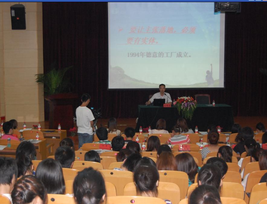 报告会中,高德康总裁以德意集团的成长之路为主线,用生动的实例和风趣的语言激励广大学子如何面对创业之初的艰辛、创业期的创新求变、项目的艰难取舍等等,并送给大家“锁定一个有价值的目标”“基础决定高度”等七点创业感悟,极大地鼓舞了师生们的学习激情和事业信念。高总裁说“从2人到3200人,从3000元到20亿元,德意用了16年,这16年非常艰辛,但德意一直瞄准着自己的目标——打造世界一流的经典厨卫品牌,以一流的精品和完善的服务不断在创新和超越。对同学们而言,你们需要的是好好珍惜大学三年,打好自己的基础,了解自己的兴趣,为开创自己的事业打下根基。”