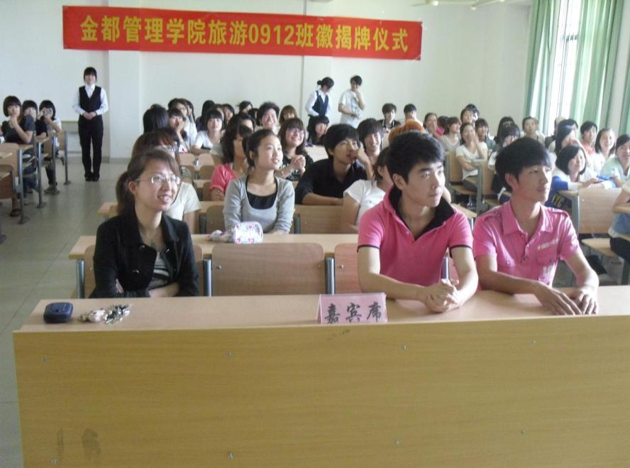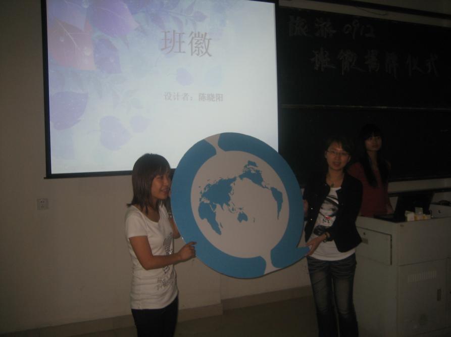 在经历了专业分流、专业课程学习和班级特色项目建设之后,由专业老师提议,学生自发举办的这次 “班徽揭幕仪式”,贯穿了一个专业课程的教学理念:老师在传授理论知识的同时,一定要让学生逐渐意识到“增强服务意识,提高职业素质”对今后参加“顶岗实习”的重要性。 金都管理学院旅游0912班,是杭州职业技术学院第一个拥有班徽的班级。 |
