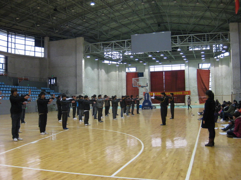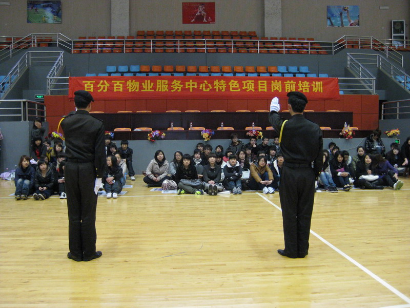 2010年4月14日下午,金都管理学院百分百物业服务中心特色项目第二次岗前培训——车辆引导手势训练在体育馆二楼顺利举行。金都集团梦琴湾佳苑物业服务中心秩序维护部长戴金辉和他的两位同事一起冒雨前往我校,为学生们做了现场的培训指导。物业管理专业全体教师、学工办老师和专业辅导员带领180多名学生一起参加了本次培训。