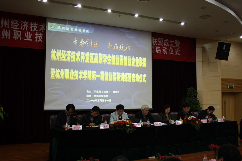 3月31日下午,杭州职业技术学院行政楼二楼报告厅人头攒动,杭州市大学生创业联盟轮值主席陈伟星、下沙经济技术开发区主任吴丽华、副主任李军纪、副院长廖志林教授、教务处副处长张赵根、金都管理学院院长谢川及下沙各高校创业协会代表、创业园企业代表等近500人一起见证了杭州经济技术开发区高职学生创业园创业企业联盟成立暨学院第一期“创业训练营”启动仪式。仪式由学生处处长裘旭东主持。