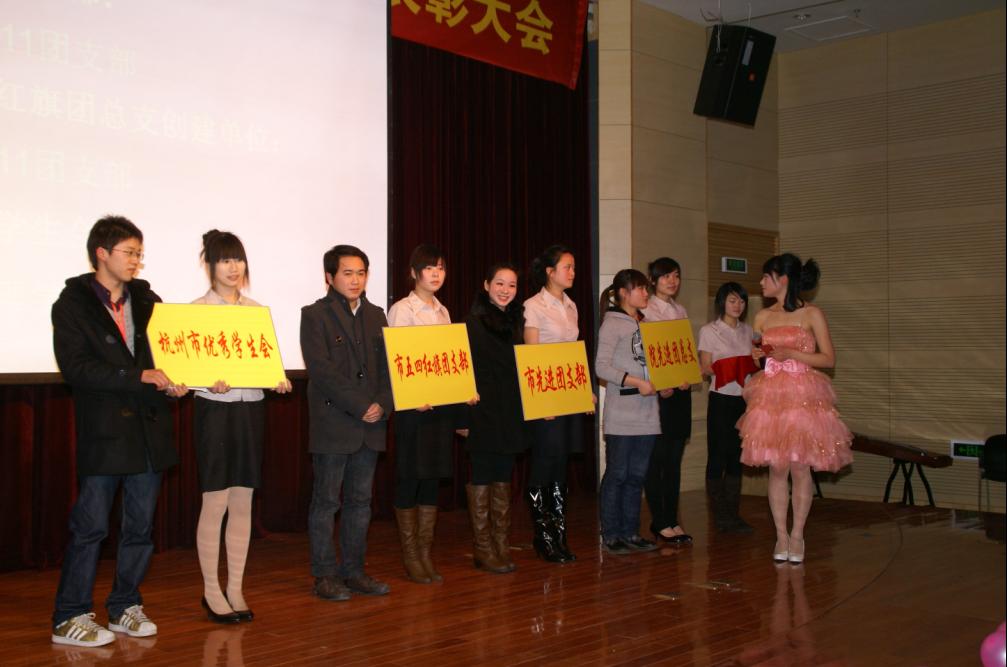 表彰大会在优美的舞蹈《大地飞歌》之后拉开序幕,共分三个环节进行。第一环节为分院奖项,包括学风建设的重点项目---“每月之星”评比之进步团员、先进团支部、先进干事和先进学生会部门,主要是激发广大团员活力、增强团支部凝聚力和提升学生会服务能力。第二环节为学院奖项,包括文明班级、先进班级、院先进团总支,主要是提升班级和团总支的集体荣誉感和团结合作精神。第三环节是市级奖项,包括市进步团员、市优秀学生干部、市先进团支部、市五四红旗团支部、市优秀学生会,主要为提升士气、树立标杆和增强使命感。晚会中还穿插了精彩的手语、相声和古筝表演,同时还揭晓了金都管理学院学生会会徽,气氛非常热烈。