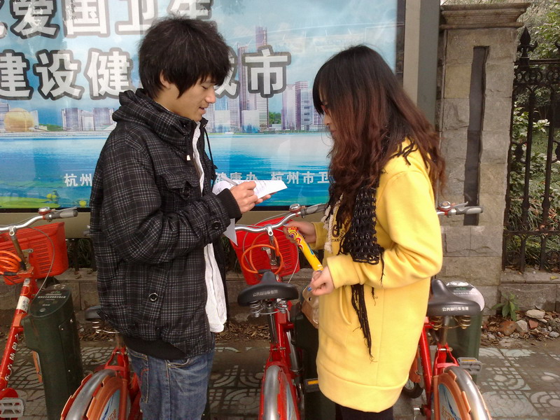 2009年12月5日至2009年12月13日期间,由袁月秋指导,营销0821班俞艳菁、陈雯琦、沈贝妮、朱楚烨、谢微娜、洪旻、盛舒、赵彦、许欢、虞欢红、张敏敏、詹秀琴、李逸俊等参与的杭州公共自行车使用状况满意度调查项目圆满结束。调查期间绝大多数同学们能够克服困难、积极主动、认真负责、按要求完成规定的任务。