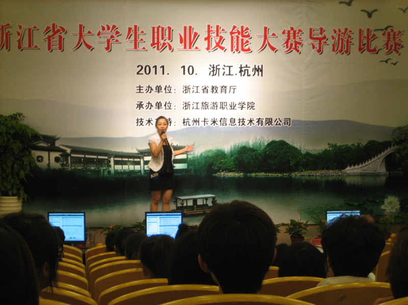 浙江省大学生导游比赛作为“2011年浙江省大学生职业技能大赛暨全国职业院校技能大赛选拔赛”之一,由浙江省教育厅举办,于10月26日到28日在浙江旅游职业学院举行。比赛由理论考试、即兴演讲、景点讲解和才艺表演等四个环节组成。共有来自全省23所本科和高职院校的86位参赛选手参加。