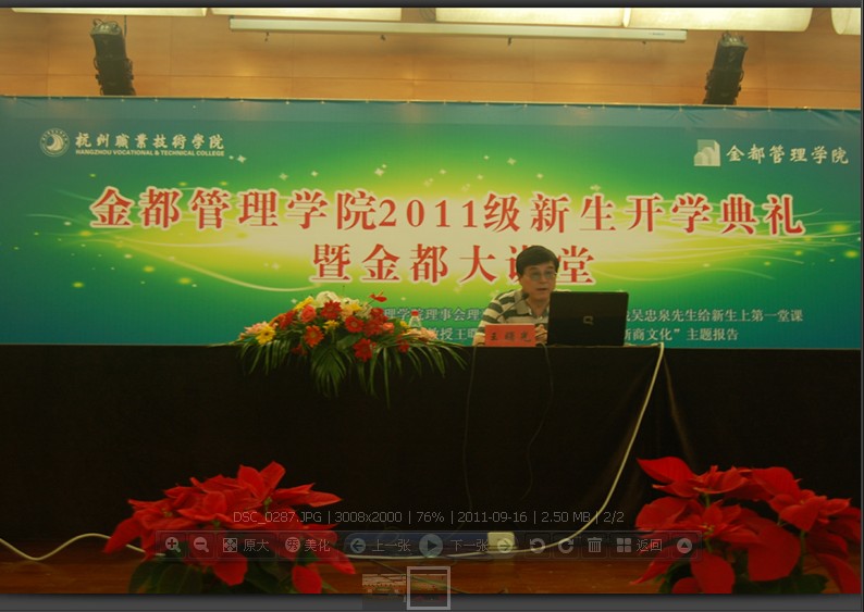 9月14日上午,金都管理学院在图书馆报告厅隆重举行2011级新生开学典礼暨金都大讲堂。参加开学典礼的有金都房产集团总裁、金都管理学院理事会理事长吴忠泉,杭州职业技术学院副院长、金都管理学院理事会副理事长廖志林,金都房产集团助理总裁、金都管理学院理事会理事郁平,金都管理学院院长谢川,以及分院各部门、专业组负责人、新生班主任和全体2011级新生。典礼由金都管理学院党总支书记韩亮主持。