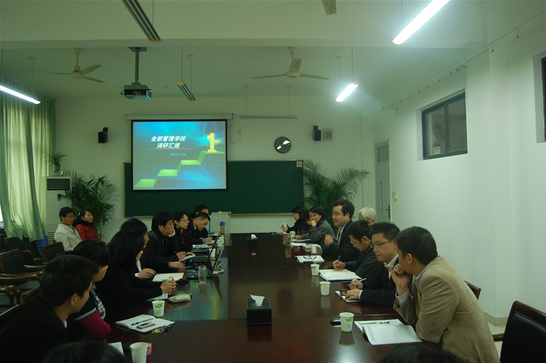分院院长谢川首先作了主题汇报。他从金都管理学院的校企共同体建设现状入手,剖析分院目前专业建设中存在的问题及原因,并从现有专业设置角度出发阐述了重新构思共同体的思考,提出了新经济专业群建设的设想。随后,电子商务、物业管理、旅游管理、财会、金融保险、文秘等专业负责人做了专业定位的专题汇报。调研中,副院长张洪宪、廖志林、贾文胜分别对分院工作提出了指导性意见,院长叶鉴铭作了总结讲话。