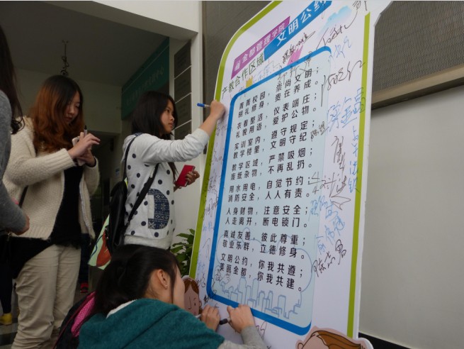 随着校企合作的不断深入,企业常驻学校人员不断增多,企业活动与学生活动、教学活动不断交织,校企文化也在不断碰撞和融合。如公共区域吸烟、门窗未及时关闭、在教室里吃中饭等。本次的签名活动,正是基于倡导文明言行,摒弃陋习,在分院内形成自觉维护文明,践行文明的良好氛围。 |