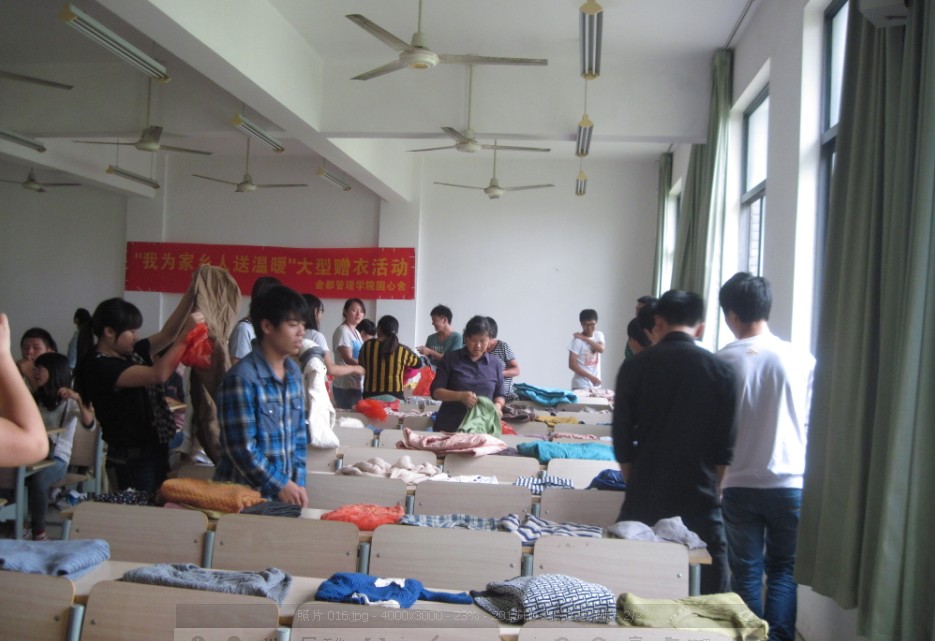 圆心舍接过爱心传递接力棒,经过前期的精心准备,于2013年9月27日下午在金都管理学院8202教室开展了“我为家乡人送温暖”的大型赠衣活动。本次活动主要面向校内的家庭困难学生。希望他们趁国庆放假的时候带着爱心衣服回家,为家乡人送温暖。新任舍长沈炎峰的动员讲话为本次活动拉开了序幕。同学们刚开始翻看衣服时显得有些局促,圆心舍的同学适时在旁边引导并带头将选好的衣服放在袋子里,气氛逐渐缓和。楼里的保洁阿姨闻讯也想参加赠衣活动,我们表示欢迎,其他楼的保洁阿姨也纷纷走进了我们活动现场。一位保洁阿姨一边拿衣服,一边不停地道谢,说她冬天都没有买过这么好,这么多的衣服。同学们也放开了拘束,彼此参考哪件衣服更适合家里人穿。看着大家高涨的热情,圆心舍决定将活动延期到国庆放假回来后继续开放三天。 本次活动也促成了各系院爱心组织的第一次交流大会。在此非常感谢各系院对我们本次活动的大力支持。圆心舍愿意不遗余力地发挥好桥梁作用,给我院贫困生搭建强能精技平台的同时营造一个同伴互助、共同成长、积极向上的“舍”氛围。 |
