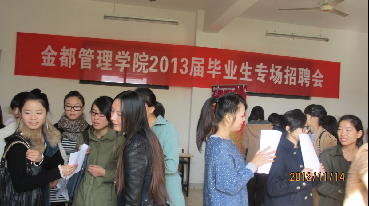 “参加了今天的招聘会,投了几份简历,在与个别招聘单位负责人咨询过后,发现很多单位需要我们这个专业的毕业生,感觉自己离成功又进了一步。”一位电商专业毕业生在金都管理学院招聘现场说道。11月14日下午,金都管理学院在8号楼举办了2013届毕业生专场招聘会,浙江金都物业管理有限公司、杭州江滨一号休闲会所有限公司、中国人寿保险股份有限公司、浙江大酒店等共计43家企业单位莅临,近600名毕业生参加。