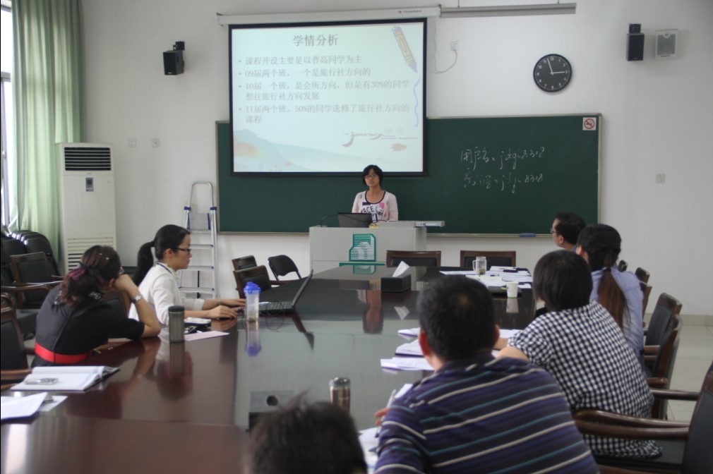 8名教师通过比赛展示了在课程建设中的成果及思路,从教学目标的确定、教学内容的处理、教学策略的设计、教学方法的运用、教学效果评价等5个方面,层层剖析讲解。