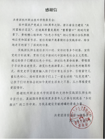近日,共青团淳安县汾口镇委员会致信我校,对我校“红色小书包”初心引领小分队师生在汾口镇展开的一系列“初心引领,童心向党”实践活动给予充分肯定。感谢信中提到:“通过给孩子们赠送红色小书包,讲述红色革命故事,带领孩子寻访身边老党员,游览红色旅游景点,举办红色村晚等形式,将党史学习教育融入孩子们日常生活当中,引领留守儿童红色初心。给村里的孩子们上了一堂生动的‘红色党课’。”