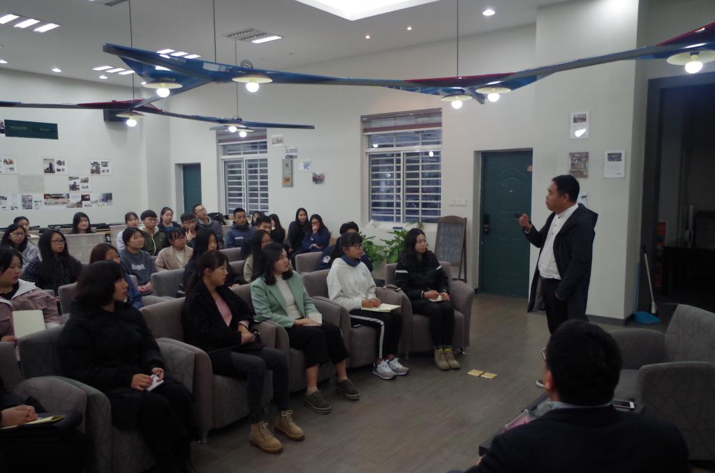 3月21日晚6点,在创业园1124会议室传出阵阵掌声,这里正在开展一次别开生面的“面对面”活动。与往常不同的是,这次“面对面”的对话嘉宾既不是领导,也不是老师,而是毕业七年,创办一家公司,2016年营业收入400多万的公司总经理——汤涛学长。