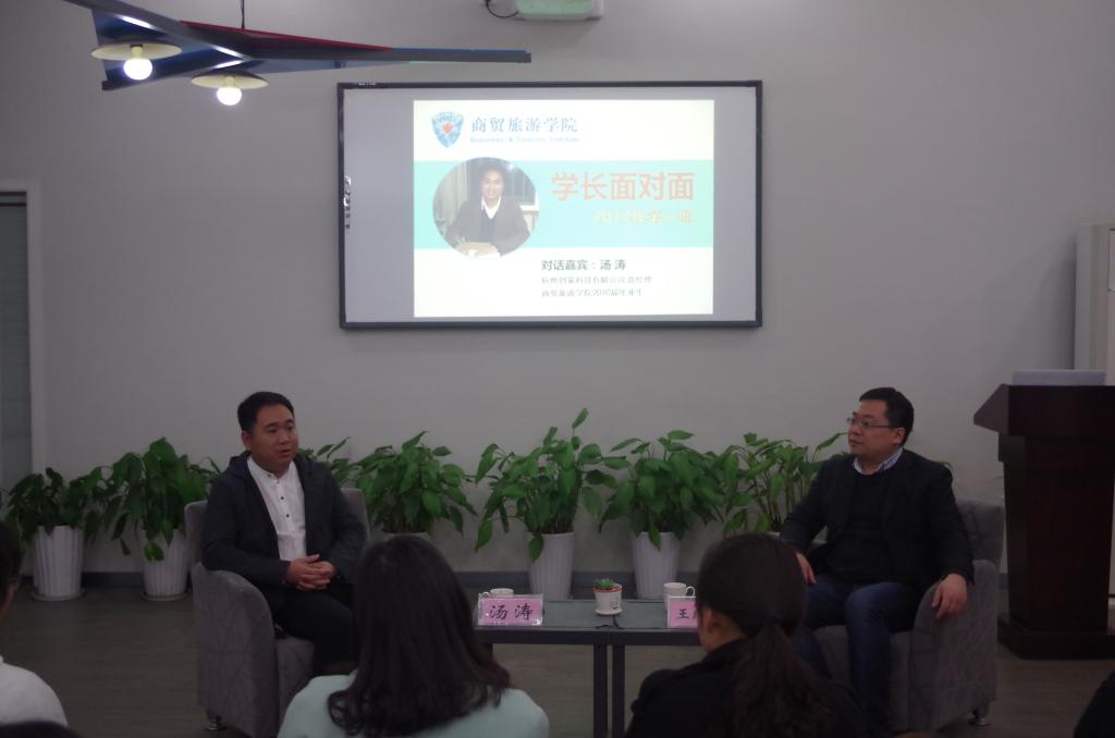 汤涛学长现任杭州创策科技有限公司总经理,是原金都管理学院2010届毕业生。这一次他回到母校,参加商贸旅游学院第一期“学长面对面”对话创业校友活动,与学弟学妹交流对话,为他们带去自己从大学以来十年的成长经历和心路历程。