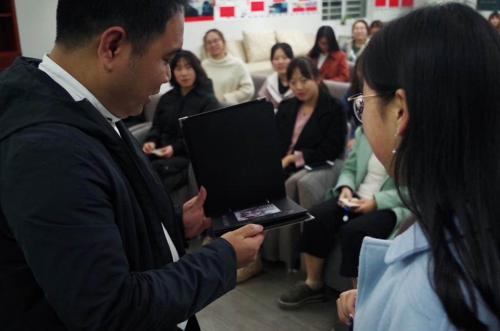 活动尾声,朱旭婷学妹代表商贸旅游学院的全体同学赠送了汤涛学长一本珍贵的手绘相册。相册记录了他在母校生活学习的点滴瞬间,汤涛学长欣然接受并承诺将常回母校与学弟学妹们探讨、分享自己的成功经验。借此机会,在座同学们还与汤涛学长自拍留念。