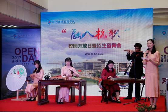 商贸旅游学院旅游管理专业提前招生宣传是本次开放日的版块之一。学院在教学楼播放了专业宣传片,在活动现场精心布置了宣传摊位,专业老师向前来咨询的考生和家长详细解说专业招生政策、教学和管理情况以及学生就业情况。在“融入杭职”的大舞台上,宋华英老师指导的茶艺社学员还为大家献上了精彩的茶艺表演,茶艺表演女生颜值爆棚,动作娴熟,手势优美,配以悠扬的筝笛合鸣和专业的现场解说,赢得了全场的注目。