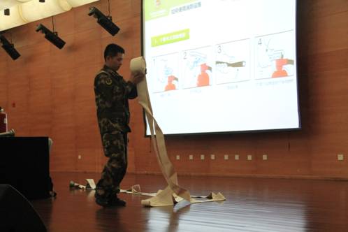 在培训上,李队长从火灾大数据入手,分别对宿舍消防安全隐患逐一讲述,阐述危害性。通过丰富的视频案例、图片案例生动鲜活的与在座的师生分享了消防要点、逃生要领、预防要诀,给在座师生很大启发。李队长还现场演示讲解灭火器和消防水带的使用方式。