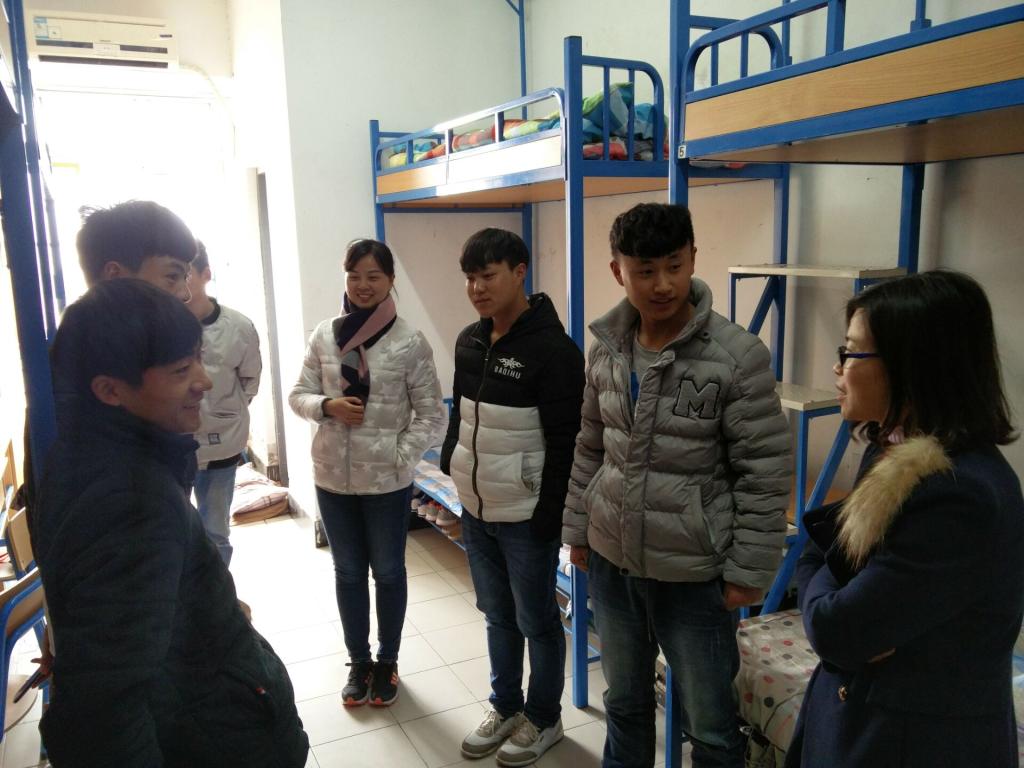 ,商贸旅游学院党总支副书记王天红与贵州电子信息职业技术学院副主任王竹前往寝室看望交流生,学工办相关人员陪同走访。