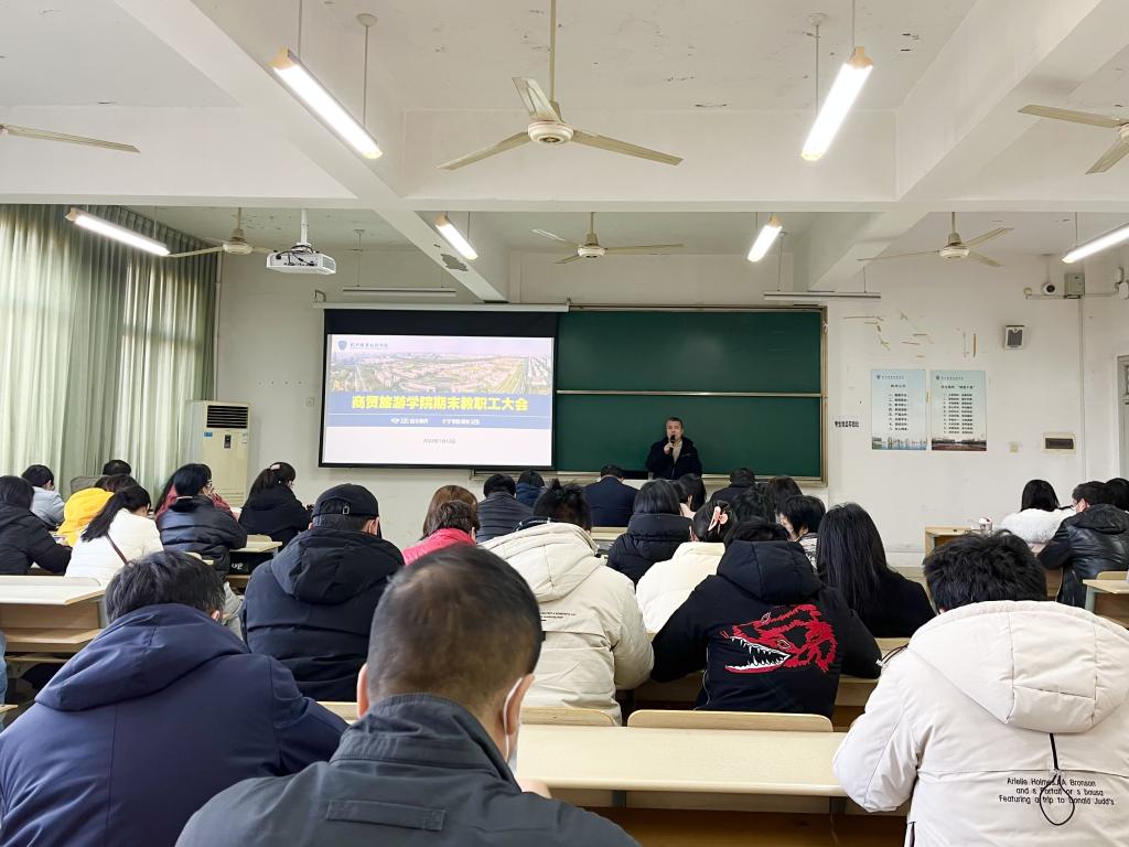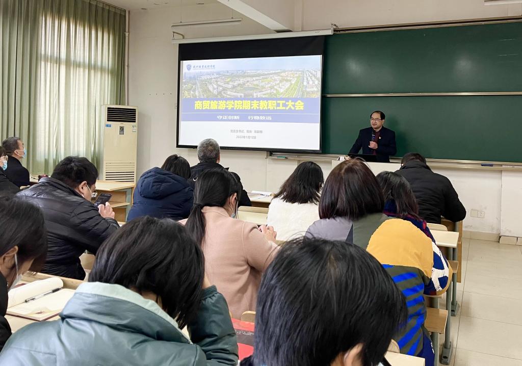 1月12日下午,商贸旅游学院在6218教室召开期末教职工学习会,分院党总支书记、院长张赵根,副书记周佳良,副院长袁江军及分院全体教职工参加大会,会议由周佳良主持。