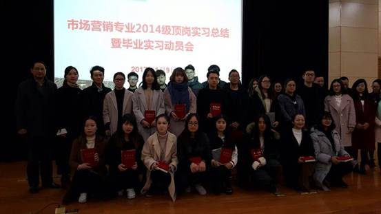 元月9日上午,商贸旅游学院市场营销专业2014级学生顶岗实习总结暨毕业实习动员大会在行政楼二楼报告厅隆重召开。来自浙江物美亿商超市有限公司、浙江链家房地产经纪有限公司、满记甜品有限公司、浙江爱生药业有限公司、温州聚焦极至企业管理有限公司的合作企业代表,商贸旅游学院院长张赵根、党总支副书记王天红、副院长戴凤微、创业学院副院长张理剑、市场营销专业全体老师、2014级班主任、235名学生参加了本次大会。