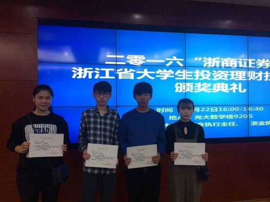 由浙江省教育厅主办、浙江金融职业学院承办的2016“浙商证券杯”大学生投资理财技能大赛于近日圆满结束。我校商贸旅游学院会计专业学生杜铭敏、林和平等在专业老师施卓晨和段勇历时一个月的组织指导下,精心准备、认真参赛,经过模拟交易和投资理财分析报告两个模块的激烈角逐,最终获得了两个一等奖的好成绩,其中林和平同学还是全省第一名。因为出色的团体表现,施卓晨老师被组委会评为优秀指导教师。