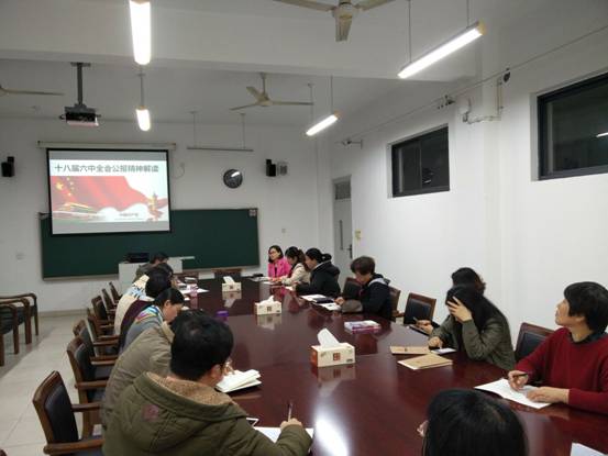 随后根据上级党组织11月的学习要点,分院党总支副书记、第五党支部党员王天红同志为在座教师带去一堂以十八届六中全会公报解读为内容的微党课。王天红同志从十八届六中全会召开的时间、成果和公报产生的历史逻辑入手,讲解了历史发展的背景和我党从建党以来自我建设的若干问题,从而引出了此次公报内容的重要关键词。王天红同志在党课中,既从大角度讲解党和国家层面的因果联系,又结合分院党员实际进行阐述,既务虚整体介绍了公报内容,又落实着重解读了每一个新词汇、新观点,信息量很大,党员受益颇多。