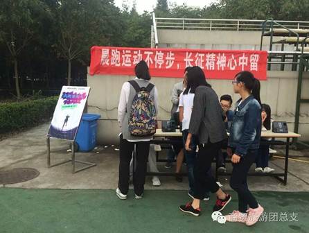 分院前期除了精心策划外,还积极营造氛围,让长征精神中坚忍不拔、勇往直前的精神感染每个商贸学生和老师,传遍整个学院。一方面,利用微信公众平台推出红色主题系列文章,在班主任群以及学生群进行宣传;另一方面,在操场晨跑签到处挂横幅以及在学院的6号、8号楼贴出大红海报宣传此次活动。