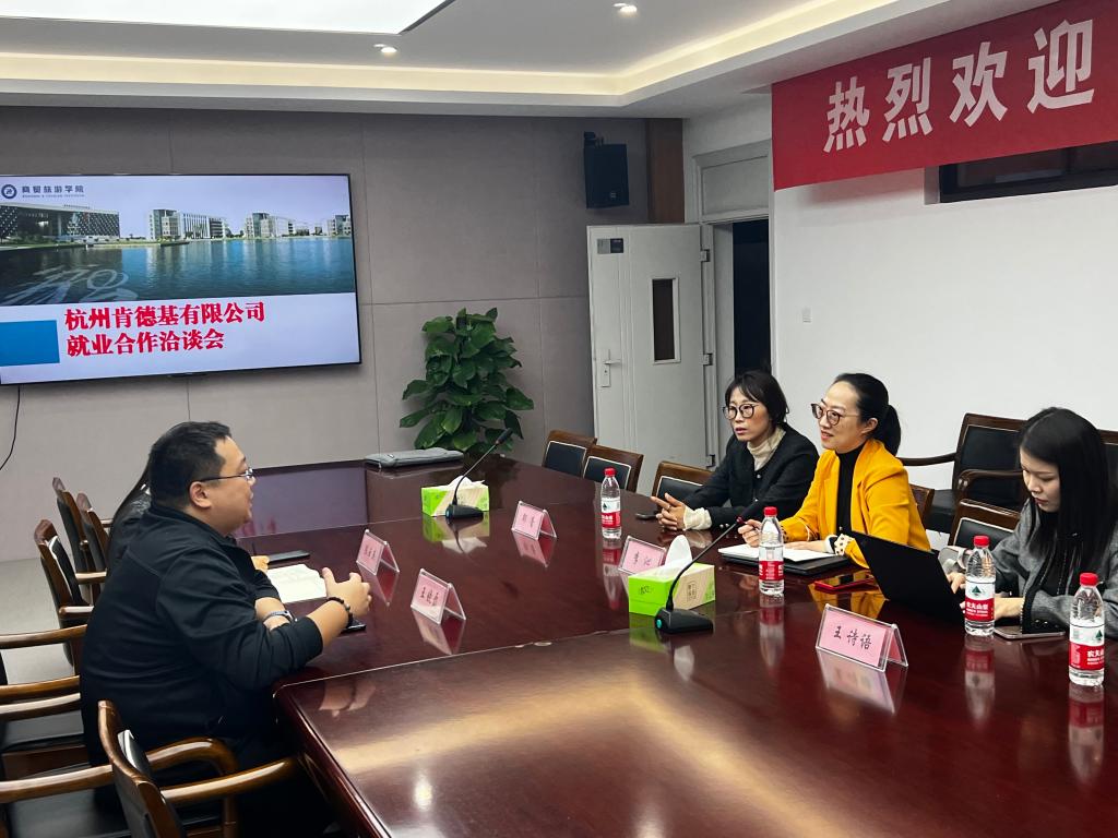 会上,王晓磊首先介绍了商贸旅游学院的分院建设、学生概况、就业工作等内容,随后李沁对杭州肯德基公司的招聘需求、人才培养成长计划等。双方在就业合作、招聘模式上进行了充分交流,初步达成了共同认识,将进一步合作,为学生发展提供双方的力量。